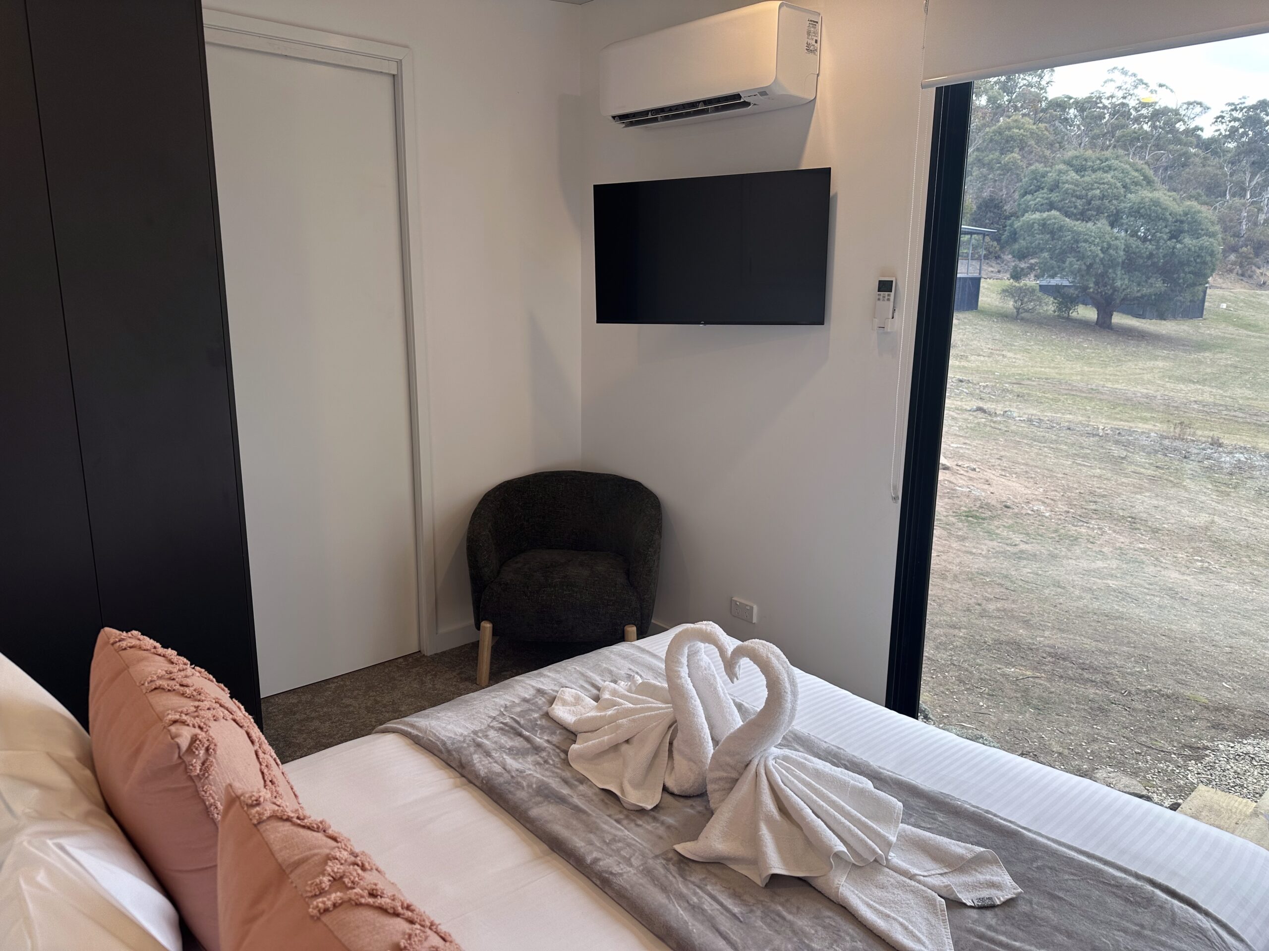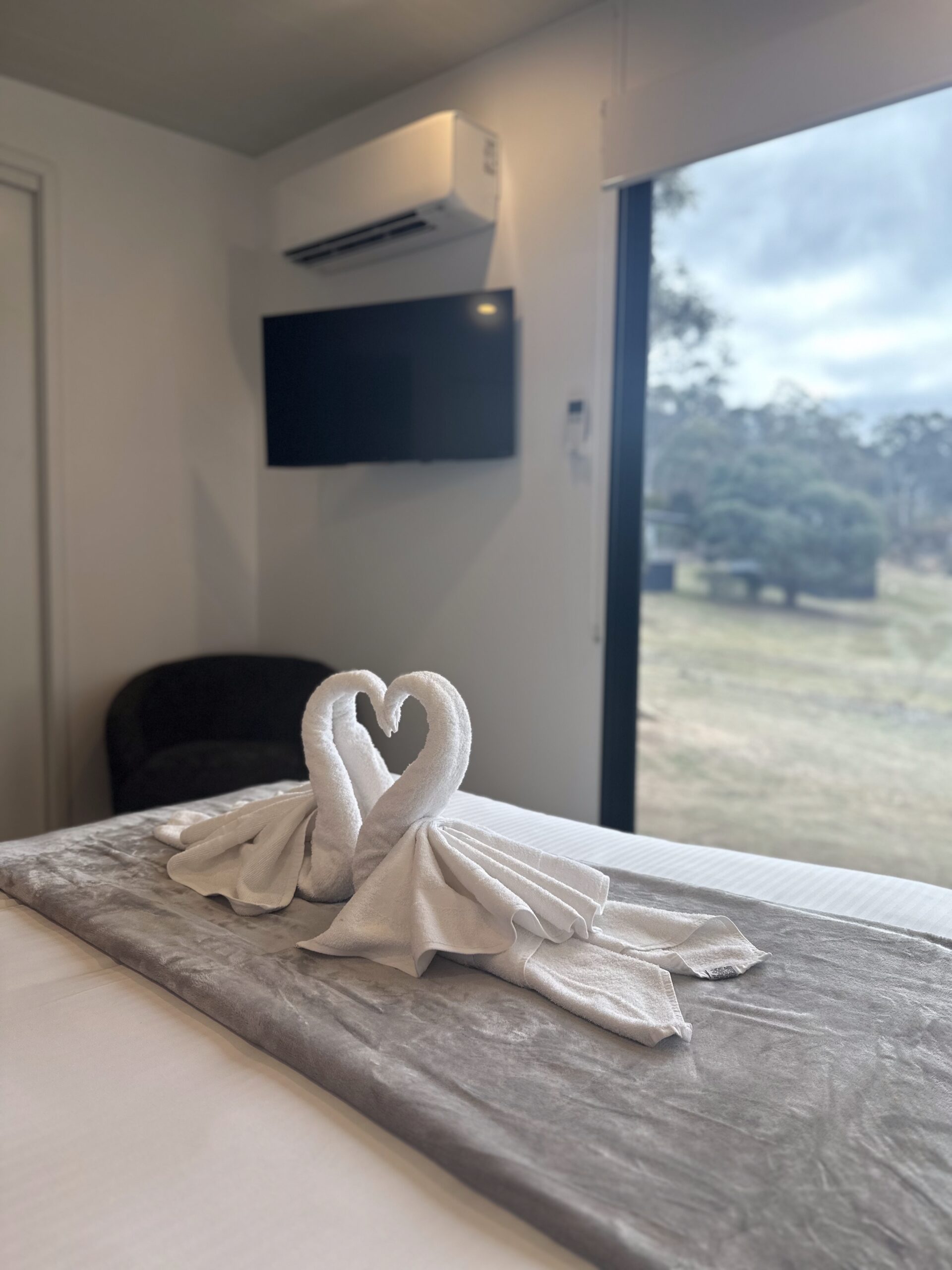 The Park View Cabin is a newly built retreat created especially for couples, combining modern comforts with warm, stylish décor that feels both luxurious and inviting. Step onto your verandah to enjoy tranquil views across the village parkland, framed by glimpses of the Snowy Mountains beyond — a beautiful backdrop for slowing down and reconnecting.
