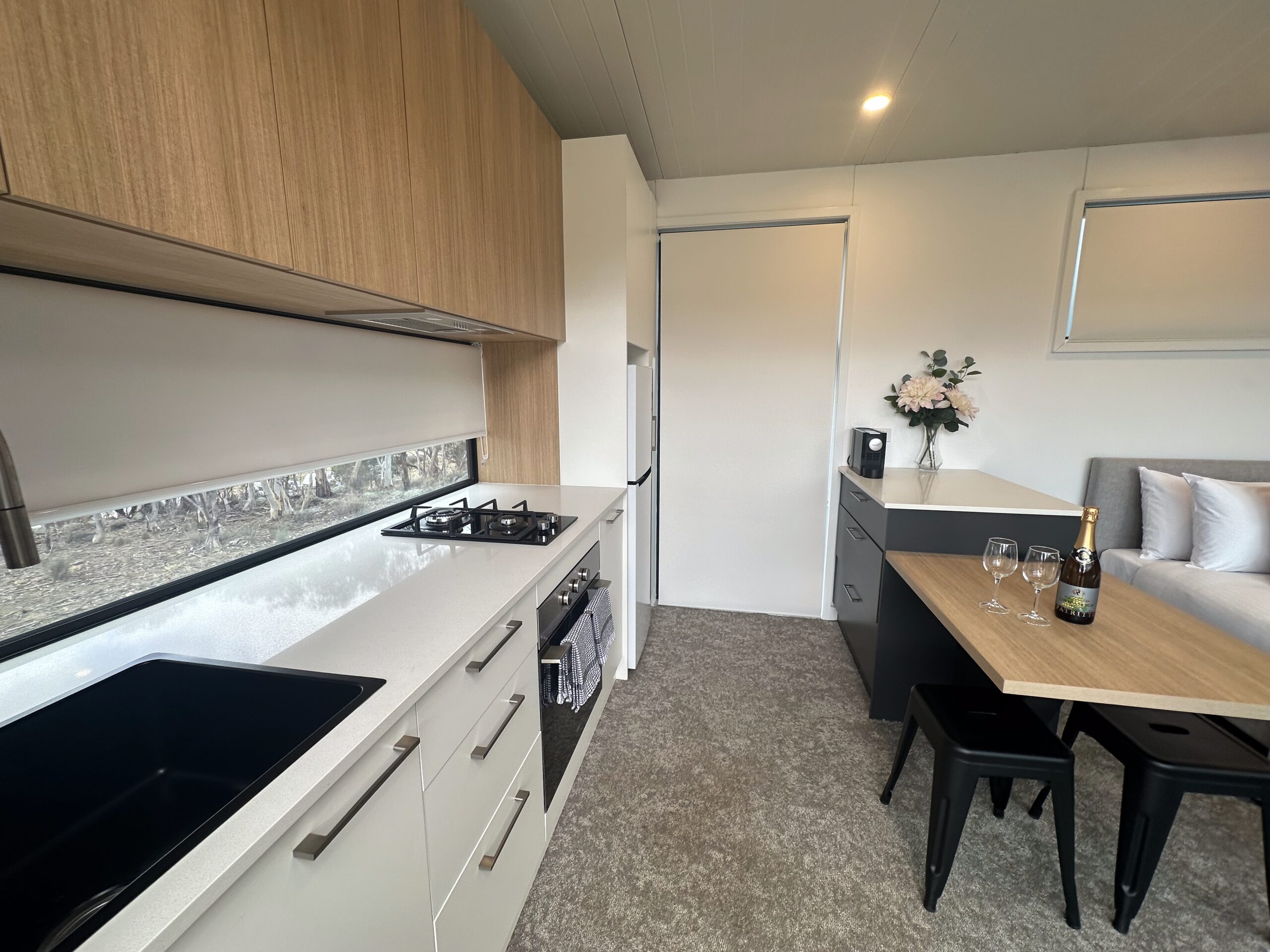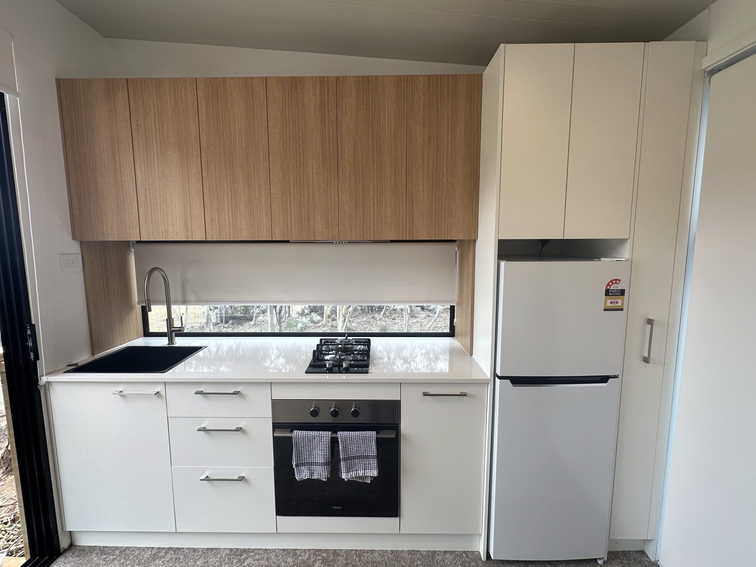 Inside, every detail is thoughtfully chosen for comfort and ease. A plush queen bed promises restful nights, while a modern bathroom and fully equipped kitchen with oven, cooktop, microwave and fridge make your stay effortless. With its blend of contemporary finishes and cosy charm, the Park View Cabin is the perfect setting to relax, recharge, and enjoy time together in the Snowy Mountains.